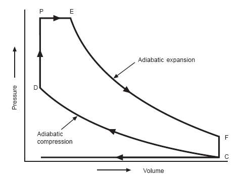O diagrama a seguir representa esses ciclos. A área do diagrama, em uma escala adequada, representa o trabalho feito no pistão durante um ciclo.