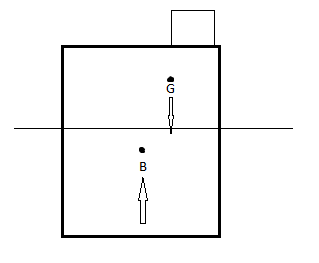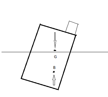 Esta situação acima causará mudança na soma dos momentos, que não será mais zero, e consequentemente o corpo irá inclinar no sentido horário, um ângulo qualquer. Um volume submerge à direta, e outro emerge a esquerda. Como resultado o centro de flutuação também se move para a direita, e o corpo flutuante encontrará uma nova posição de equilíbrio quando os pontos G e B estiverem novamente na mesma linha vertical.