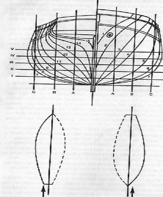 Se o casco fosse cortado de extremidade a extremidade, horizontalmente, seria fatiado em camadas com aparência paralela das extremidades e dos lados, mas cada fatia tomaria uma forma curva quando vistas de cima.